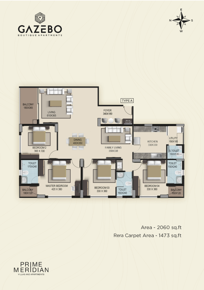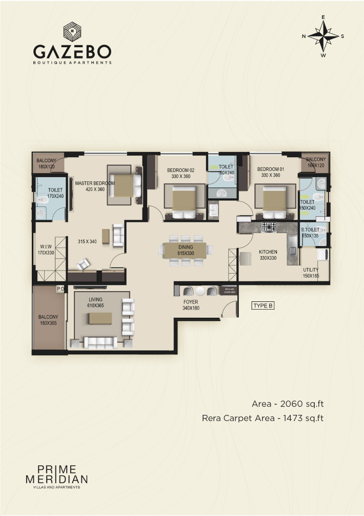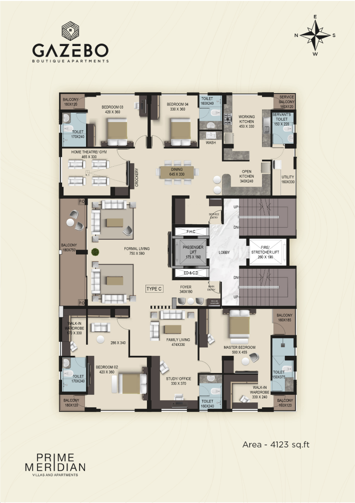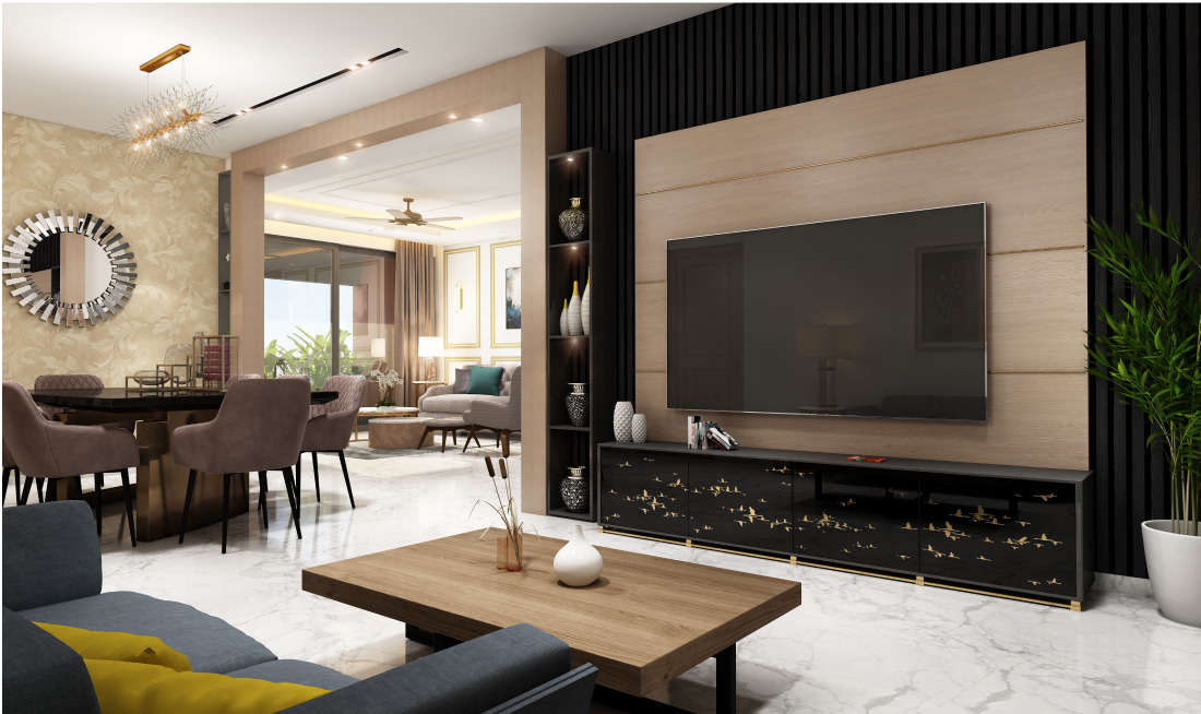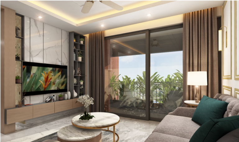 60 x 120 cm premium quality branded vitrified tiles for living, dining, bedrooms and kitchen. Rustic finish tile for balcony. 60x60cm Ceramic tiles of premium quality for toilets. Toilet walls with 60x60cm Ceramic tile up to false ceiling height. Vitrified/Granite tiles for lobby, staircase, and common areas.